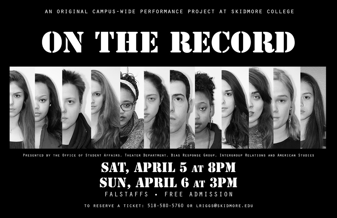 On The Record, was an original campus-wide interdisciplinary theater piece created in response to an alarming increase in bias incident reports on campus. Based on the model of documentary theater and the works of Anna Deavere Smith, we grounded the project in reported bias incidences, interview transcripts, testimonials of unreported bias, research on practices of other colleges, and actor-generated writing. I worked with a team of colleagues, including the Dean of Students and faculty in American Studies and Sociology, to develop the project over the course of a year. When it came time to audition and create the piece, I served as faculty directing supervisor to a talented trio of Skidmore theater directing students: Emily Moler, Brandon Bogle and Izzy Howard. Each performance was followed with small group conversations facilitated by students and faculty trained in Intergroup Relations, a program designed “to support student learning and competencies around inter- and intra-group relations, conflict, and social justice across a range of social identities, including race, gender, sexuality, social class, religion, and nationality.”